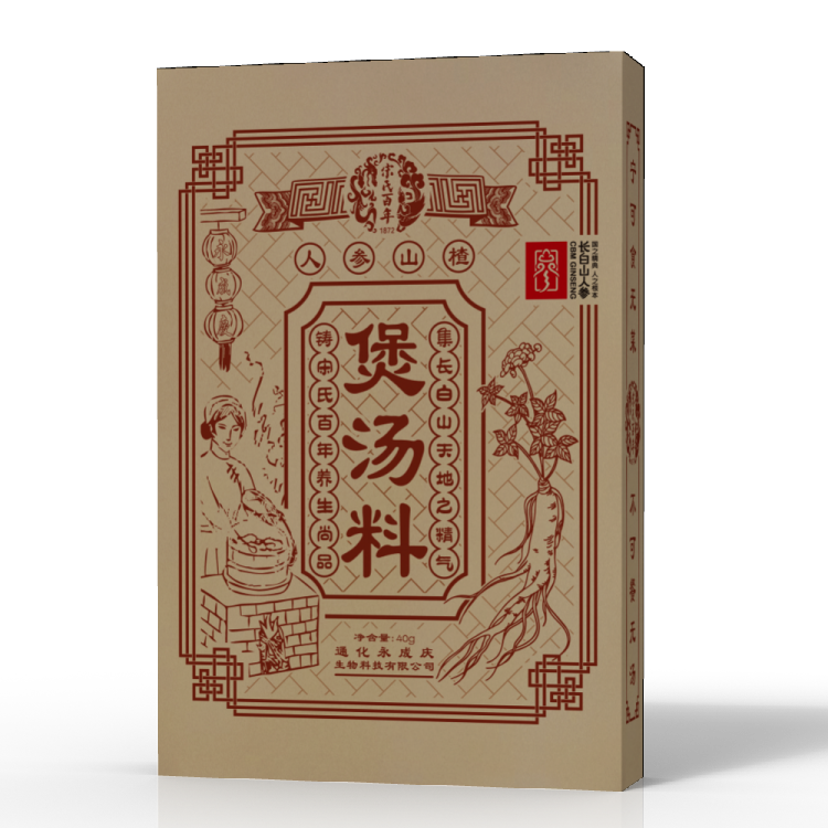 本款煲湯料精選人參、山楂、桔紅、麥芽、茯苓、山藥、佛手、雞內(nèi)金、等多味優(yōu)質(zhì)藥食同源的中草藥加工而成。